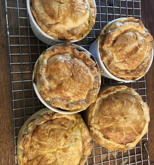 Preheat your oven to 400°F (200°C). Cut puff pastry into squares large enough to cover your ramekins or mini pie tins. Spoon the filling into the dishes, place the puff pastry on top, and press around the edges to seal. Cut a small slit in the center for steam to escape. Brush with egg wash.